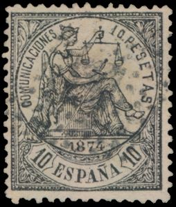 N° 150 "1874 - allegory - 10 pesetas black", expertised, rare