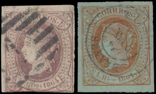 N° 62 + 63 "1864 - 19c. violet brown" and "1 real brown on