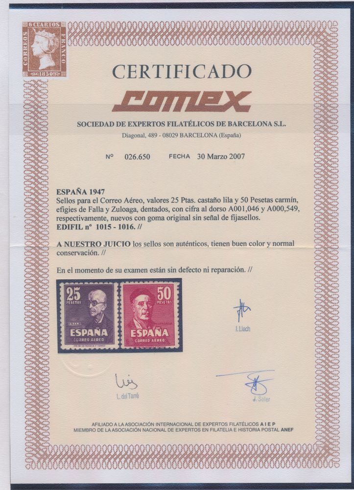 4549 nh imageLP 236/37 "1947 - de Falla and Zuluaga", superb mint with certificate Comex, vf (Yv. €350)(Image 1) (Image 2)