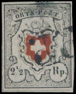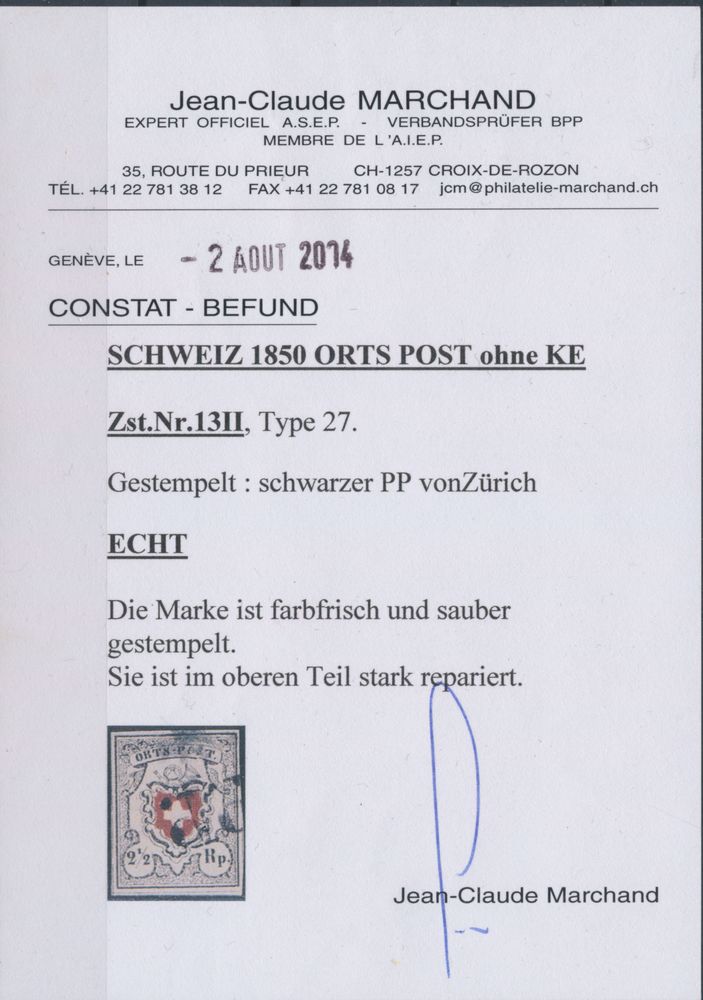 4583 0 imageN° 13-II T 27 "1850 - Orts Post 2 1/2rp. Ohne Kreuzeinfassung" with cancellation "PP" (Zurich), repaired top side, certificate Marchand, to be checked (Zumstein 3,500sfrs.)(Image 1) (Image 2)
