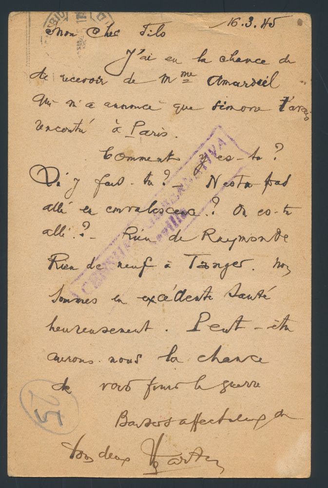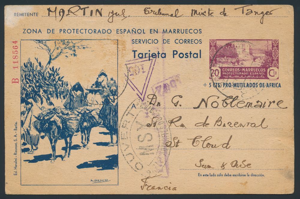 4574 PWS imageSpanish Morocco, 1945, stationery "20cts wine red" enclosed with ?? (missing stamp) sent from Tangier 17/3/1945 to St Cloud / France, via Madrid, with Spanish censorship and French censorship marks, rare, to be checked(Image 1) (Image 2)