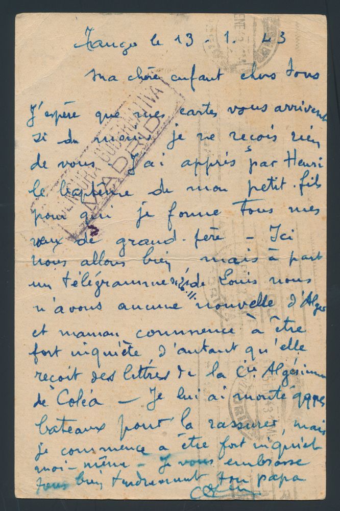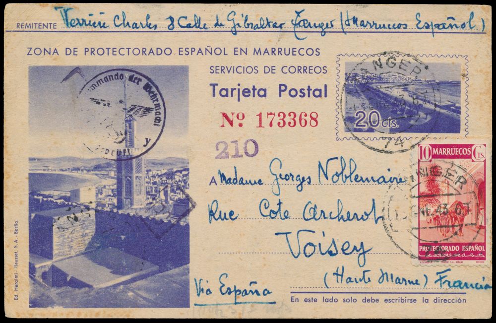 4573 PWS imageSpanish Morocco, 1943, stationery "20cts blue" franked with 10cts red, sent from Tangier 15/1/1943 to Voisey/France, via Madrid 15/1, with Spanish censorship and German censorship marks, folded but still rare, vf/f/to be checked.(Image 1) (Image 2)