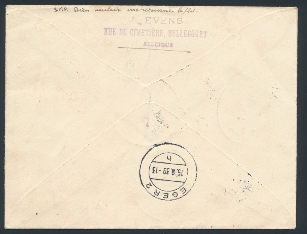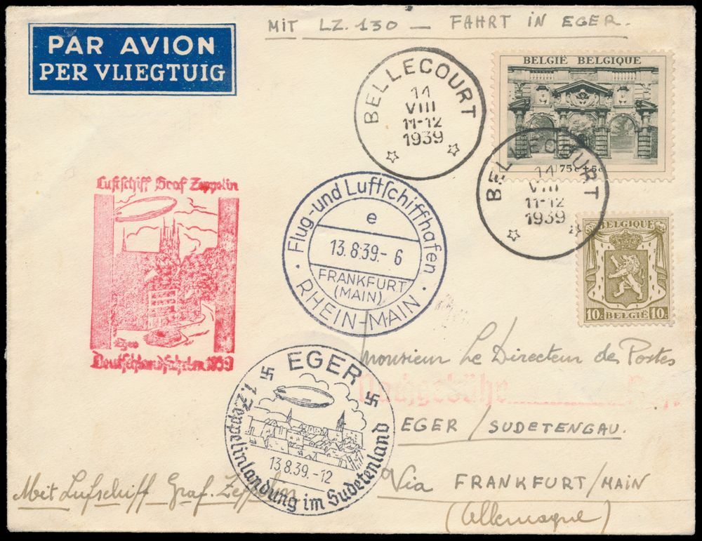 4638 image1939 N° 506 and 420, on cover with blue sticker "Par Avion / By plane", with relay cancellation "Bellecourt", dated 11 August 1939, to Eger (Sudetengau), via Frankfurt/Mainz (Allemagne), beautiful cancellations on front such as "1. Zeppelinlandung im Sudetenland - Eger", manuscript "MIT L.Z. 130 - Fahrt in Eger", vf.(Image 1) (Image 2)
