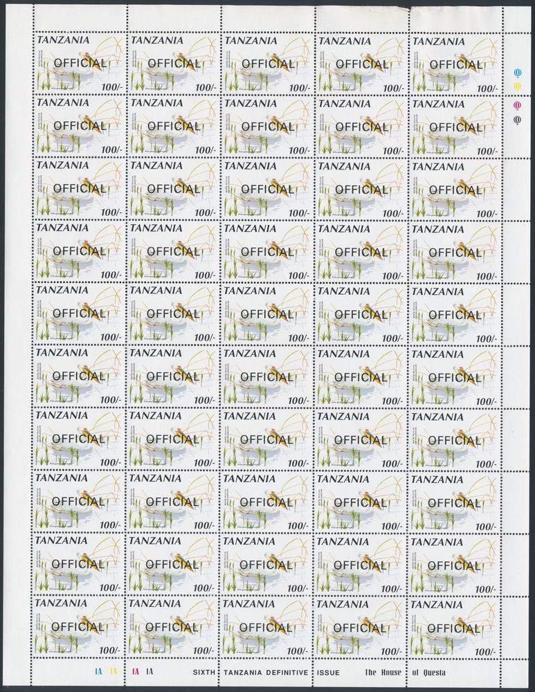 4627 nh imageBIRDS Tanzania, "service n° 37/45 birds" with overprint "OFFICIAL", 100x in full sheets and sheetlets, some damage in sheet margin, all stamps perfect, vf (Yv. €1,000)(Image 1) (All Images)