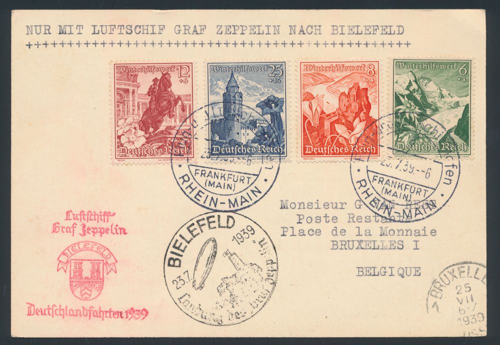 4637 image1939 Germany, Yv. 619, 620, 621 and 623, on card, "Nur mit Luftschip graf Zeppelin nach Bielefield", cancelled "Rhein-Main Flug- und Luftschiffhaven", dated 23 7 1939, to Bruxelles. Nice cancellation "Bielefeld zeppelin post", vf.(Image 1) (Image 2)