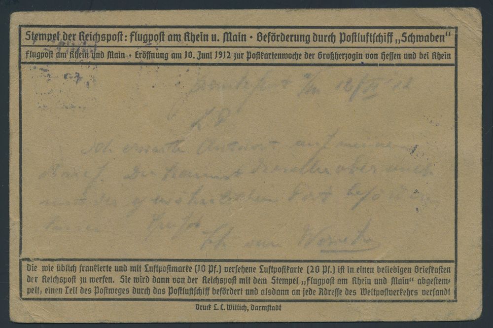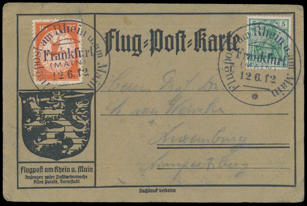 4636 image1912 Germany, nice postcard Zeppelin post "Flugpost am Rhein u. Main", nice round cancellation dated 12 June 1912, to Luxembourg, vf(Image 1) (Image 2)
