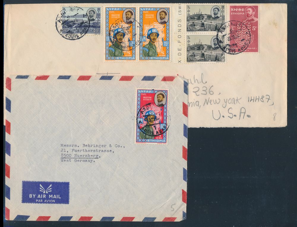 4634 imageEthiopia 1964/1966, 2 airmail letters sent from ADDIS ABEBA to Germany and USA, franked with UNO stamps (Congo operation), vf(Image 1) (All Images)