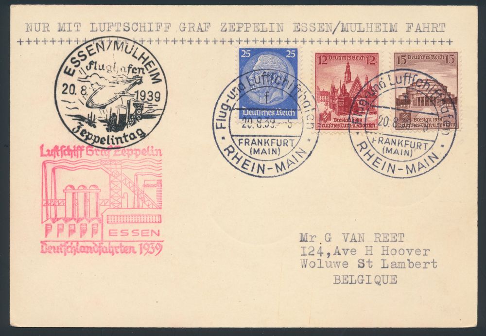 4635 image1939 Germany, Yv. 610 and 611, on card, "Nur mid Luftschip graf Zeppelin Essen/Mulheim fahrt", cancelled "Rhein-Main Flug- und Luftschiffhaven", dated 20 8 1939, to Woluwe St Lambert, nice stamp "Deutschlandfahrten 1939 ESSEN", vf(Image 1) (Image 2)