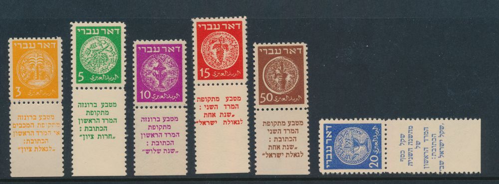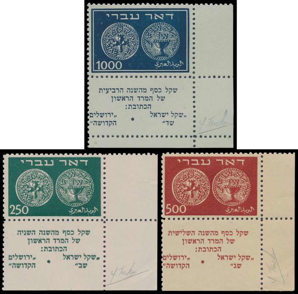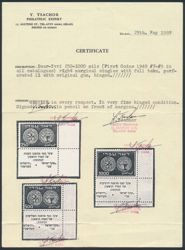 4710 nh/og imageN° 1/9 "1948 - old coins" with full tab, 3 highest values corner pieces certificate (1/6 **) Tsachor", vf (Yv. €14,000) - see photo cover(Image 1) (Image 2) (Image 3)
