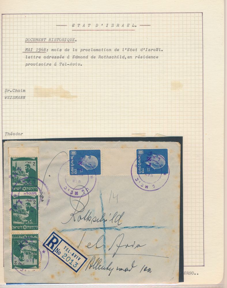 4715 image1948 (May), registered letter, sent locally in Tel Aviv, franked with rare forerunners, Th. Herzl in vertical strip of 3 wo. inverted + Weissman in vertical pair with intermediate panel with weather spots, f(Image 1) (All Images)