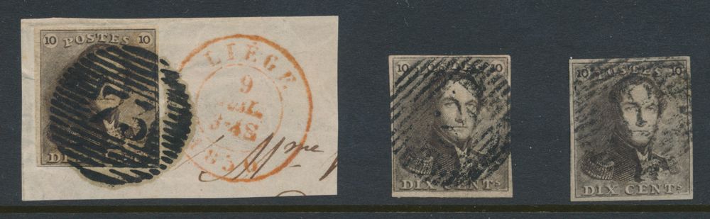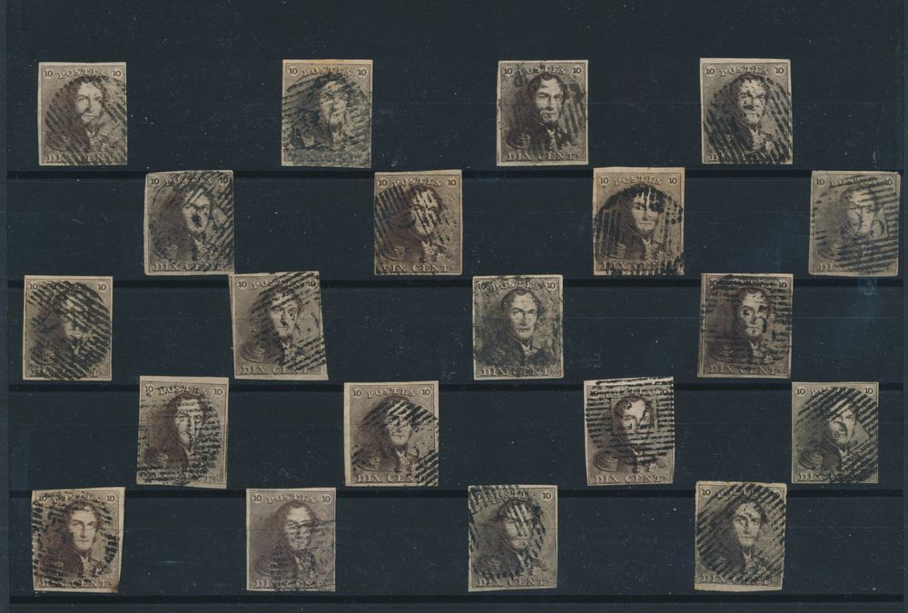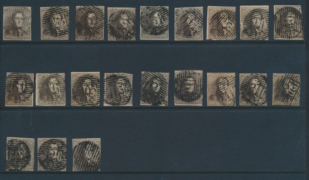 769 0 imageN° 1 "10c. brown", 5 items, fully margined, cancelled P.25-Charleroi, P.42-Fontaine-l'Évêque etc.(Image 1) (Image 2) (Image 3)