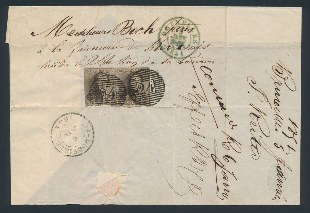 762 image1851 N° 1 "10c. brown", in pair on letter section, from Bruxelles, P.24, dated 5 January 1851, to La Louvière, nice arrival postmark, f/to be checked.(Image 1) (All Images)