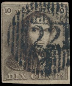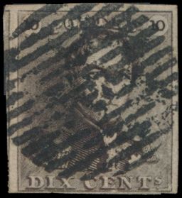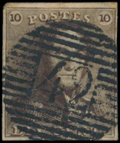 767 0 imageN° 1 "10c. brown", fully margined with full left neighbour, with cancel rulemaking (14-bars), vf (COBA €75)(Image 1) (All Images)