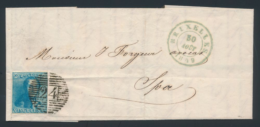 777 image1849 N° 2 "20c. blue", with colour shade "teal" on letter with contents, stamp is slightly touched top right, from P.24-Bruxelles, dated 30 August 1849, to Spa, archival fold, f(Image 1) (Image 2)
