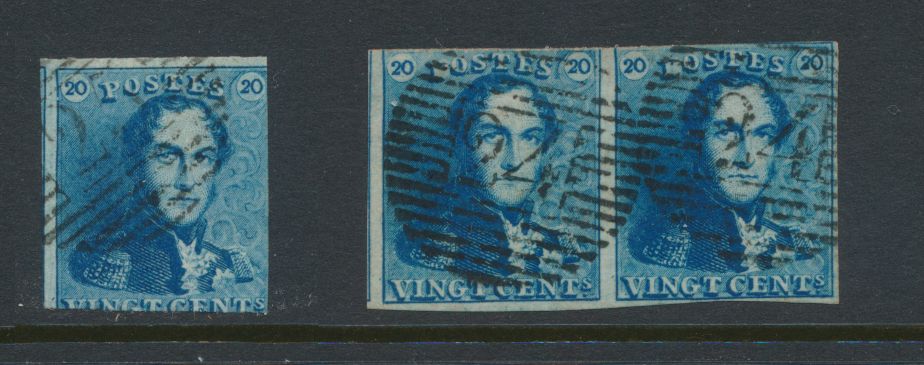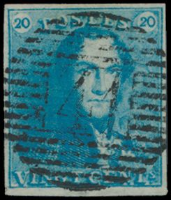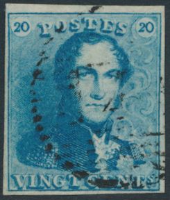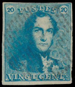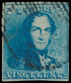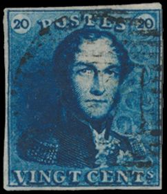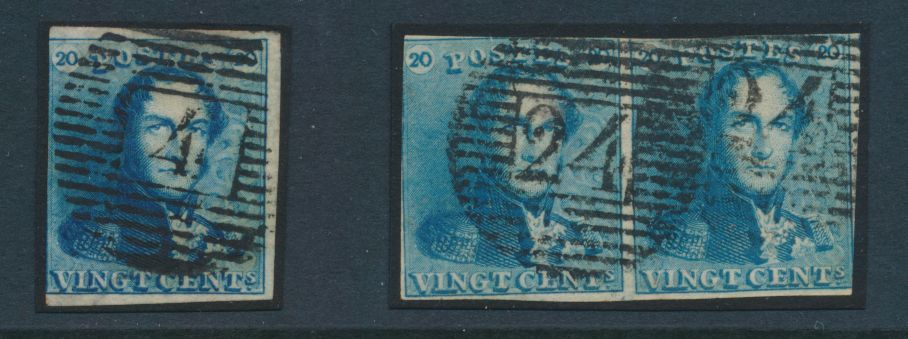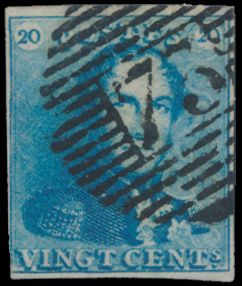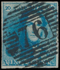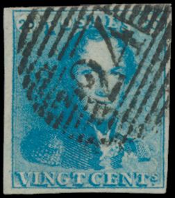 780 0 imageN° 2-Cu "20c. blue", colour shade tending towards milk blue, fully margined, cancelled P.24-Bruxelles, with beautiful curiosities "horizontal extension of upper left frame corner", "horizontal griffe in lower left margin" and "thickening of left vertical frame line with spur at bottom", beautiful(Image 1) (All Images)