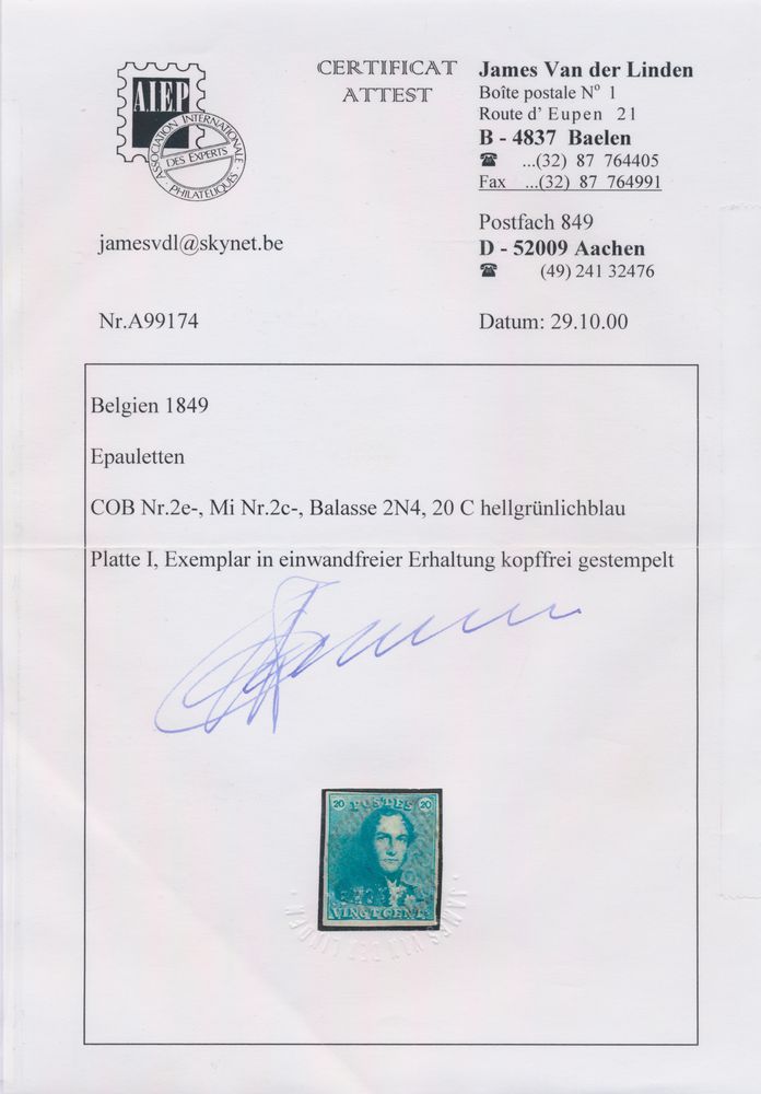 775 0 imageN° 2e "20c. teal", nicely margined, with very nice stamp image for a cancelled stamp, with certificate James Van Der Linden, very nice colour shade, vf (OBP €300)(Image 1) (Image 2)