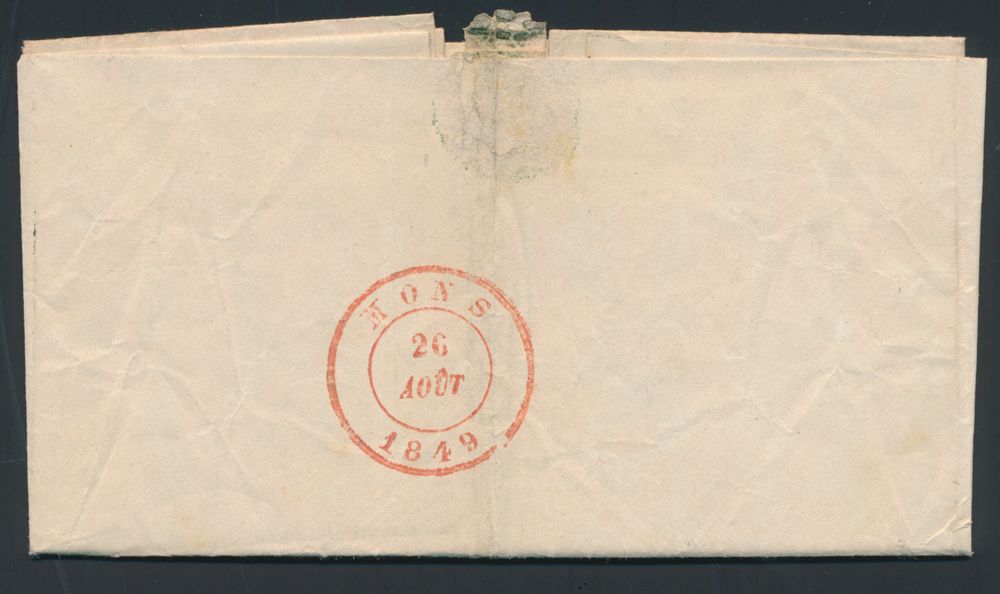 766 image1849 N° 1 "10c. brown", on letter with contents, cancelled D.50-Solre-sur-Sambre, departure stamp type 18, dated 26 August 1849, to Mons, post box mark L in circle black (Solre/Sambre), with letter address Fontaine Valmont, vf/f(Image 1) (Image 2)