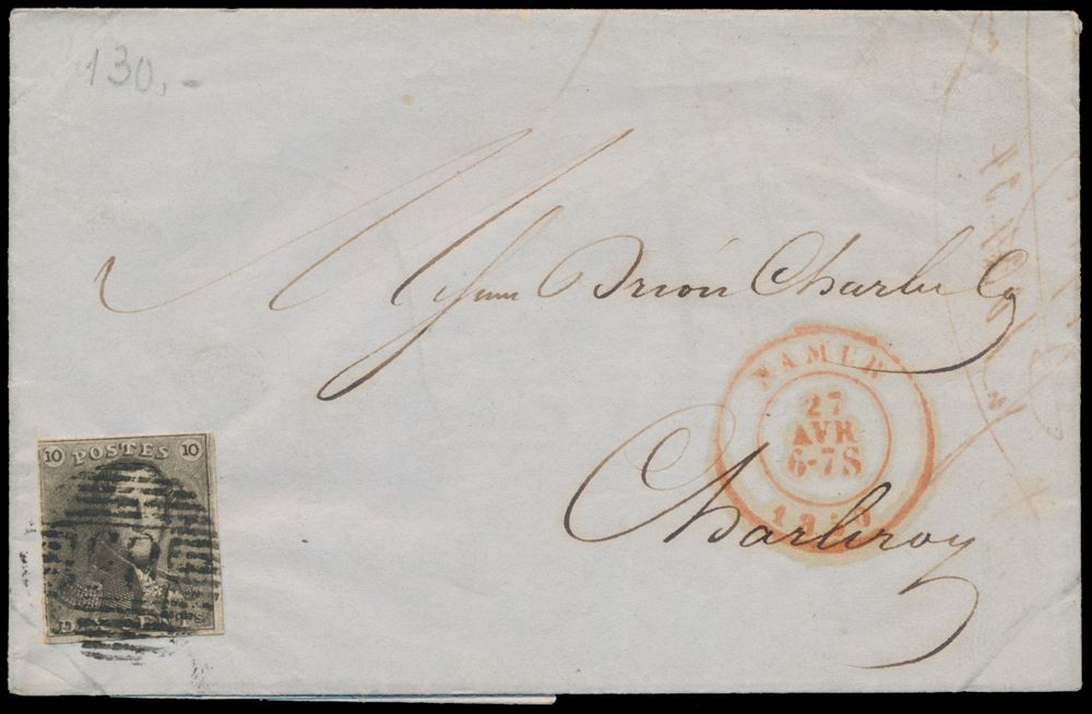 761 image1850 N° 1 "10c. brown", on letter with contents, cancelled P.85-Namur, dated 27 April 1850, to Charleroi, stamp is fully margined, but has damage to left frame line, vf/f(Image 1) (Image 2)