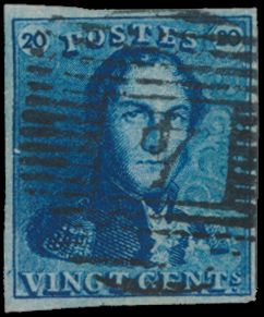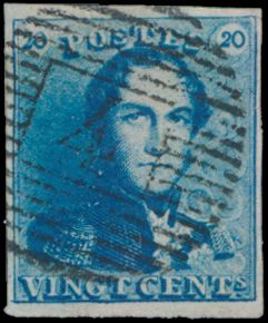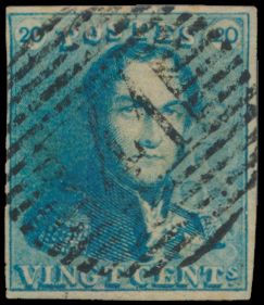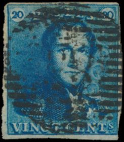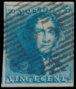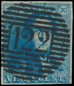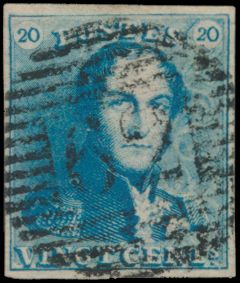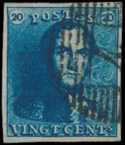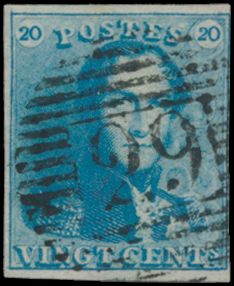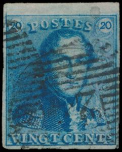 800 0 imageN° 2A-Cu "20c. blue", fully margined, nice colour shade, curiosity "double horizontal lower frame line" in left corner, cancel P.4-Anvers, vf (OBP €110)(Image 1) (All Images)