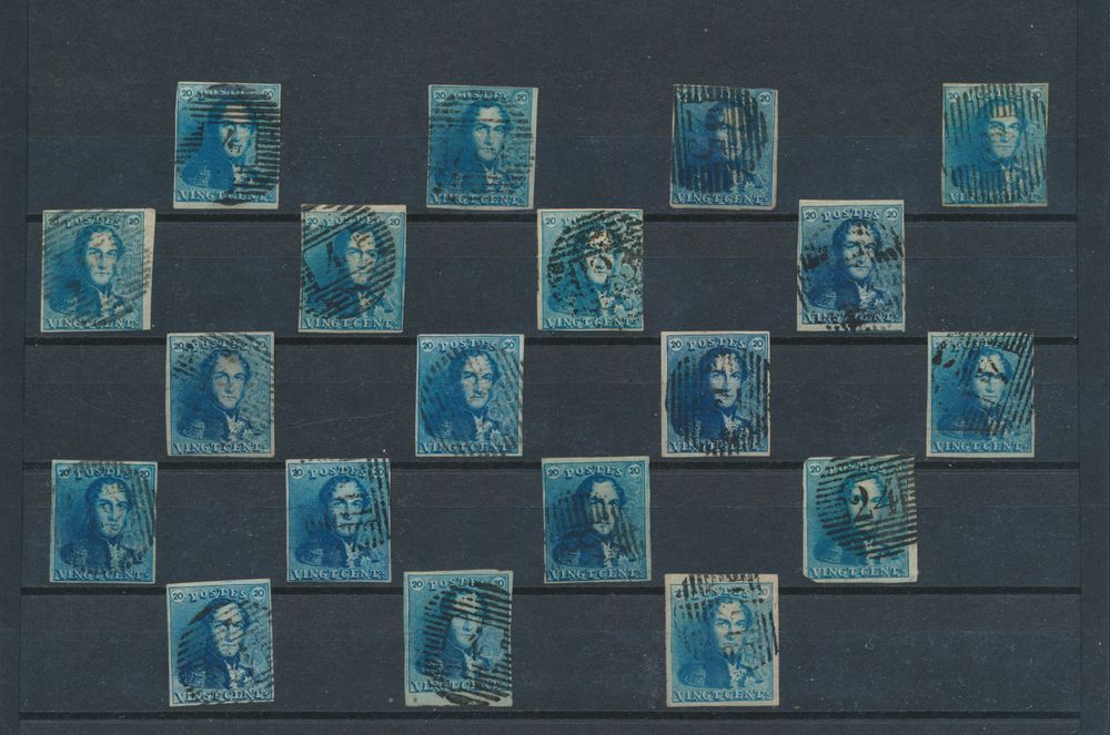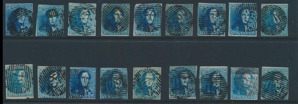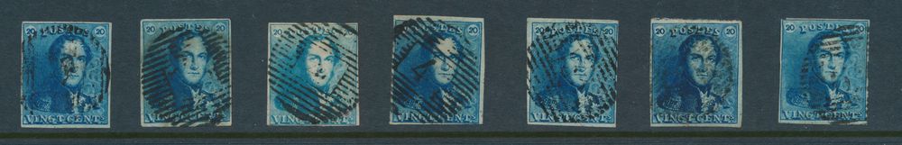 790 0 imageN° 2 "20c. blue", 7 items, all margined, cancelled P.62-Huy, P.4-Anvers, P.133-Ypres, several nice colour shades, vf (OBP €420)(Image 1) (All Images)