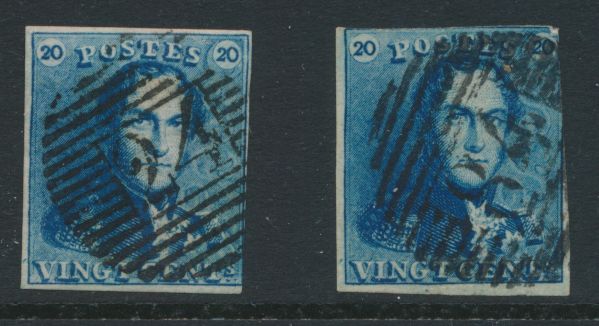 789 0 imageN° 2 "20c. blue", 3 items including 1 fully margined, cancelled P.4-Antwerp and P.84-Muscroen, vf (OBP --€270)(Image 1) (All Images)