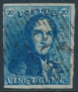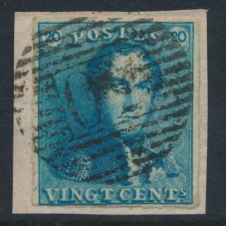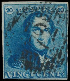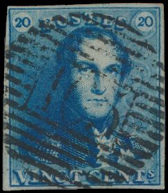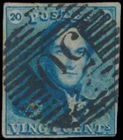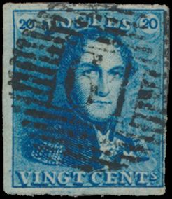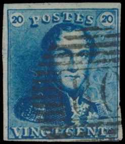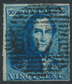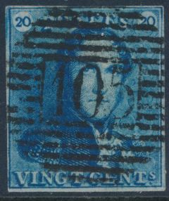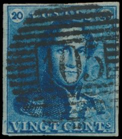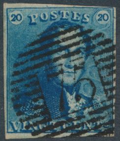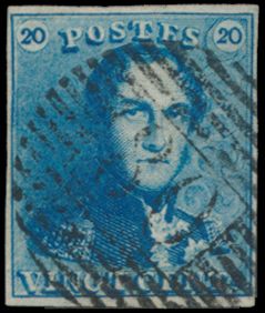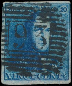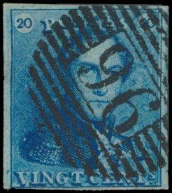 N° 2A "20c. blue", fully margined, central cancel P.83-Mons,