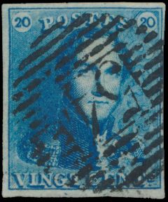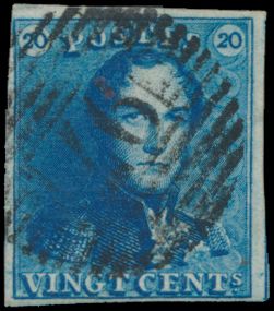 N° 2A "20c. blue", fully margined, central cancel P.54-Hamme,