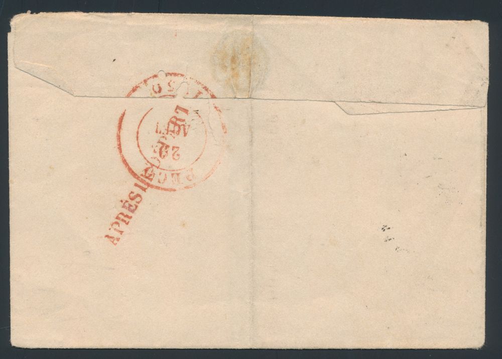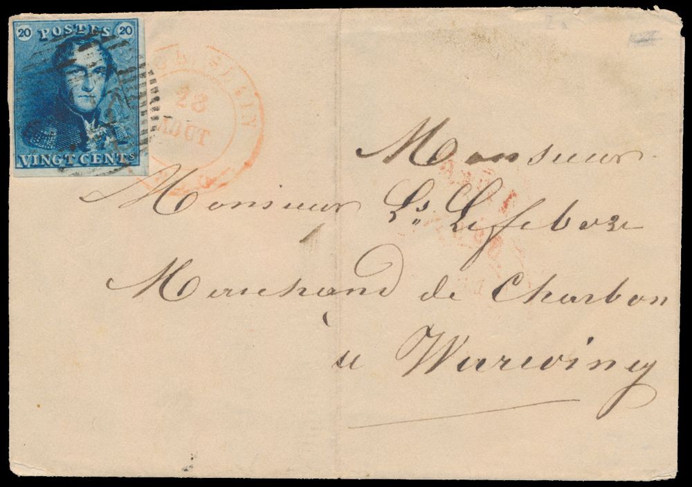 862 image1850 N° 2A. "20c. blue", fully margined on letter without contents, cancel P.103-St. Ghislain, dated 28 August 1850, to Warcoing, arrival postmark "Pecq", dated 29 August 1850, on reverse "Après le depart" in red small letters, vf(Image 1) (Image 2)