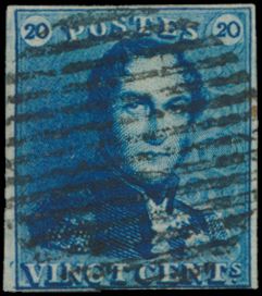 867 0 imageN° 2A "20c. dark blue", fully margined, central cancel rural 14 bars, vf (OBP €60 + COBA €100)(Image 1) (All Images)