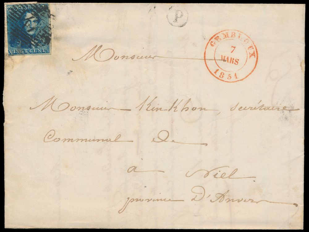 864 image1851 N° 2A "20c. blue", on letter with contents, slightly left touched, from P.47-Gembloux, dated 7 Mar 1851, to Niel (receipt mark Boom), nice post box mark "P" in circle black (St.-Denis), vf/f (OBP ++€150)(Image 1) (Image 2)