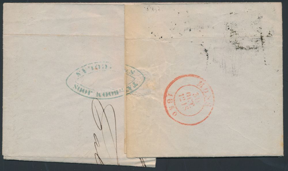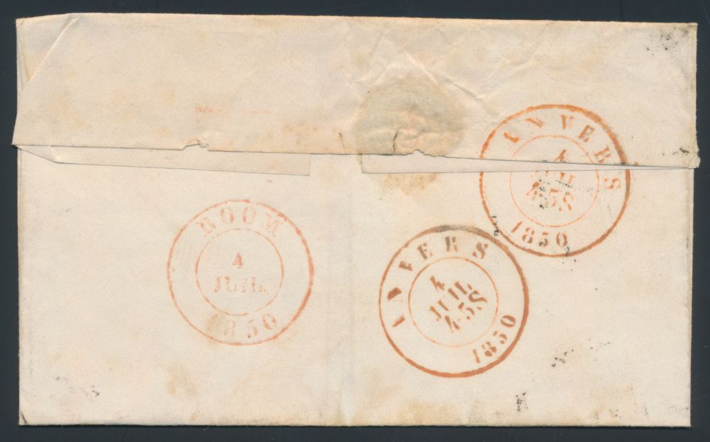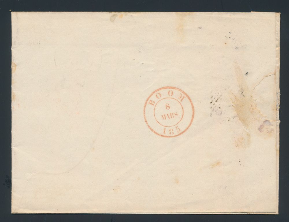 861 image1850 N° 2A "20c. blue", on letter without content, slightly touched, from P.73-Liège, dated 4 July 1850, to Niel (receipt mark Anvers (2x, dated 4 July) and Boom, dated 4 July), exceptional to 3 receipt marks on reverse, manuscript "pressee", vf/f (OBP ++€150)(Image 1) (Image 2)