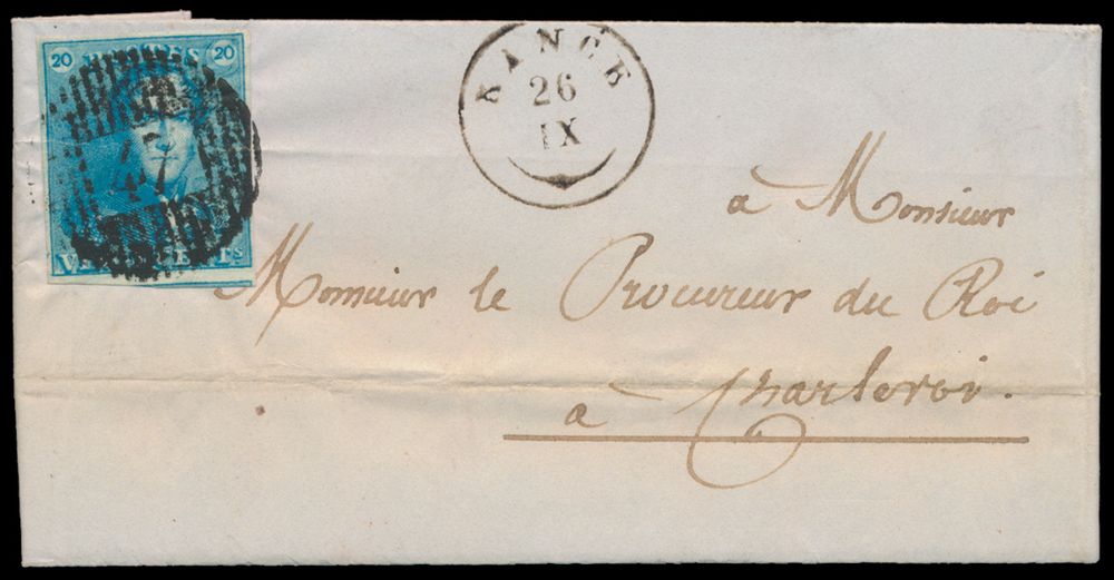 868 image1849 N° 2A "20c. blue", fully margined with lower neighbour, on letter with contents, cancelled D.47-Rance, type 18 cancellation, dated 26 Oct 1849, to Charleroi, vf (OBP €150 + COBA €50)(Image 1) (All Images)