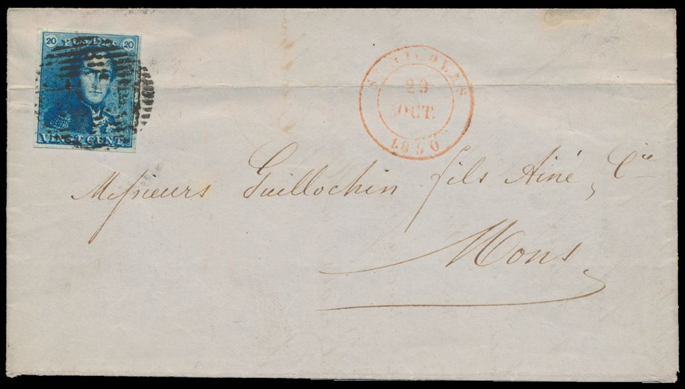 863 image1850 N° 2A "20c. blue", fully margined with letter fold, letter with contents, cancelled P.105-St.-Nicolas, dated 29 October 1850, to Mons, vf(Image 1) (Image 2)
