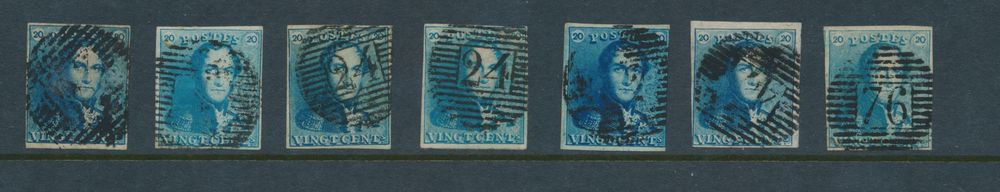 N° 2/2A "20c. blue" (7x), fully margined, with some nice