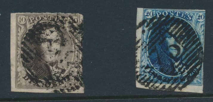 959 0 imageN° 4 "20c. blue", 2 items, fully margined, nice griffe in margin top left, cancel P.4-Anvers, vf (OBP €140)(Image 1) (Image 2)