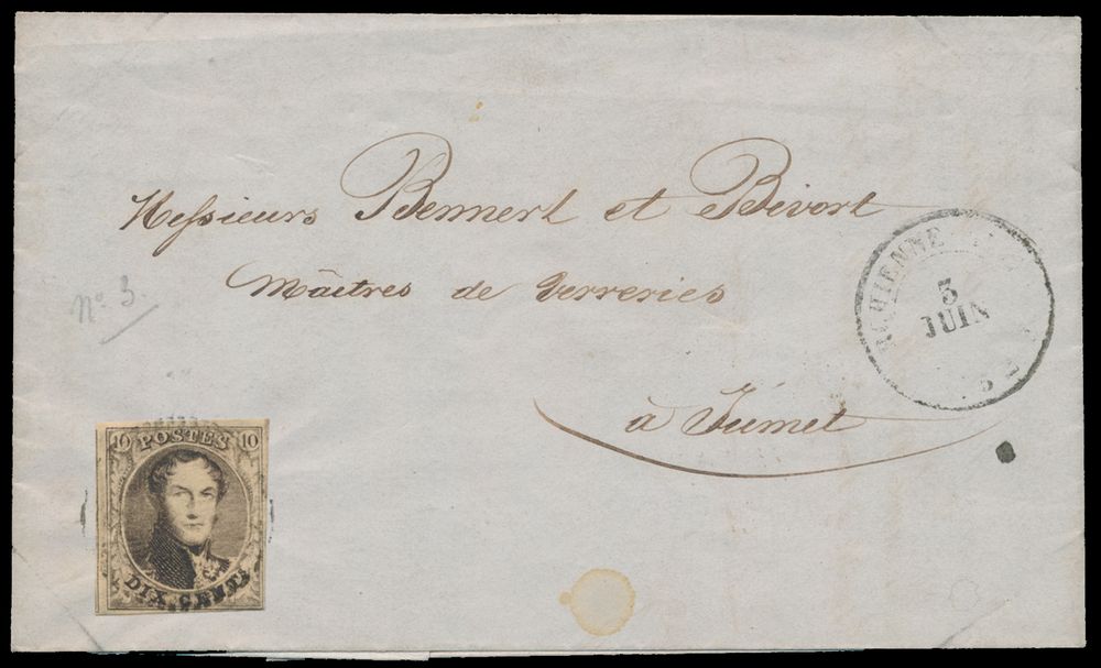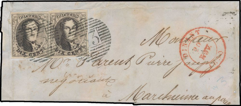 943 imageN° 3 "10c. brown" on letter fragment, two items both margined, from Dinant, dated 20 November 1850, to Marchienne-au-Pont, vf (OBP €200)(Image 1) (All Images)