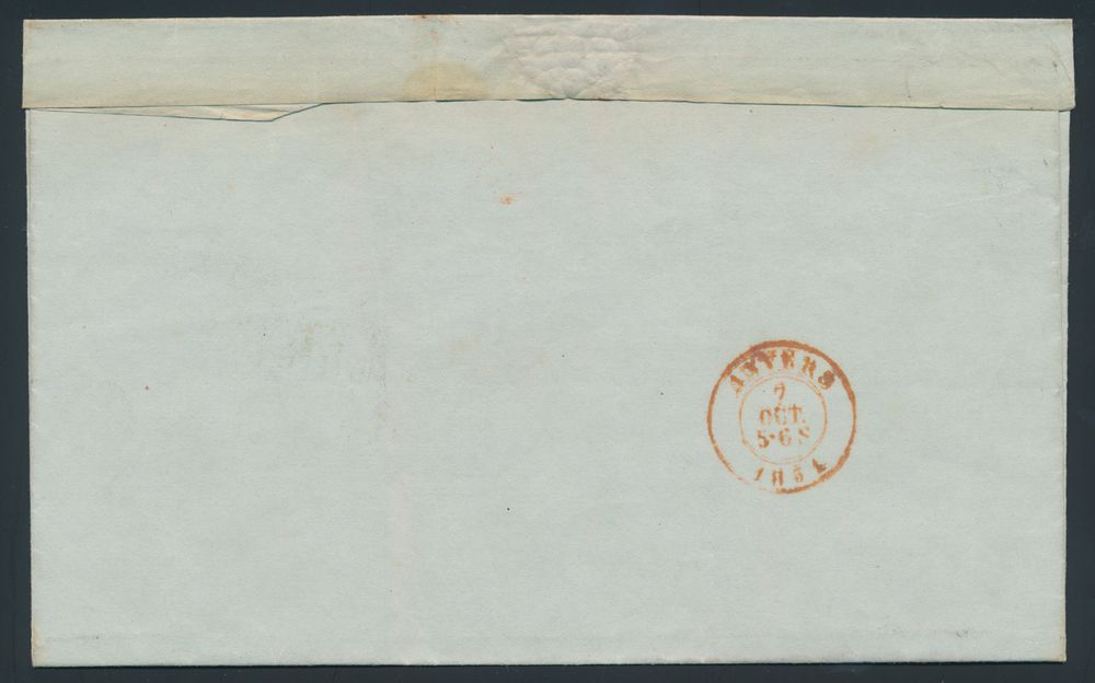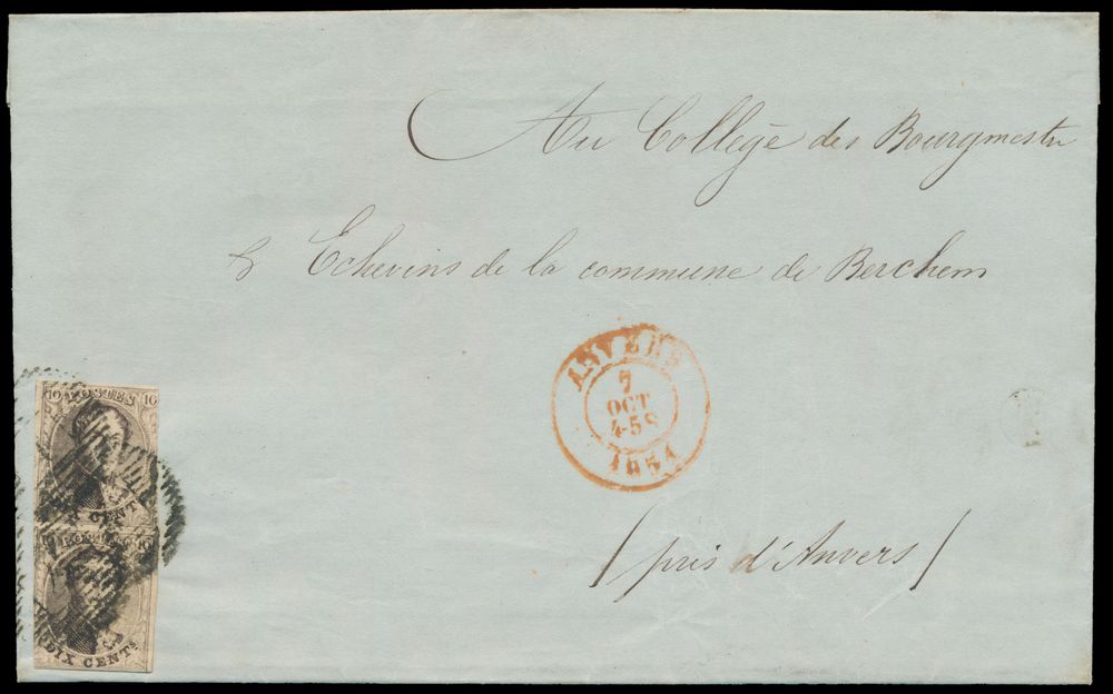 944 image1851 N° 3 "10c. brown", upright pair, incised on letter without contents, cancelled P.4-Anvers, dd. 7 Oct. 1851, to "de la commune de Berchem- prés d'Anvers", arrival postmark is on the same day but 1 hour later, double charge within 30 kilometres, no weight indication, vf/f/to be checked (OBP ++€450)(Image 1) (Image 2)