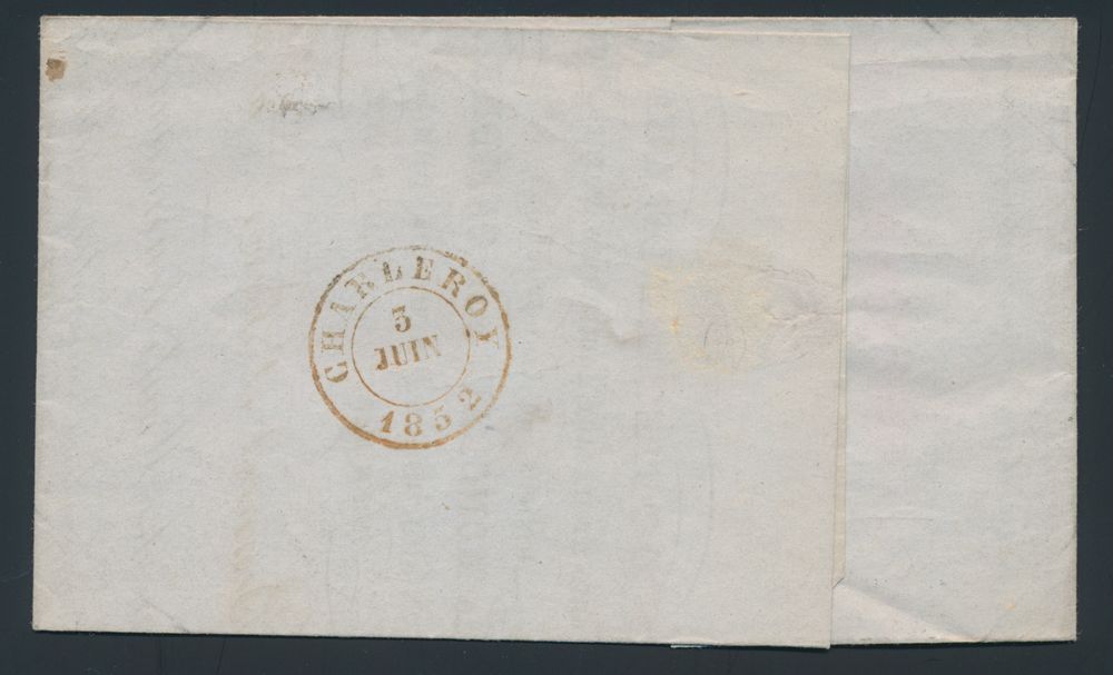 945 image1852 N° 3 "10c. brown", fully margined with left-hand neighbour, on letter with contents, with unreadable stamp P.80-Marchienne-au-Pont, with black departure stamp, dated 3 June 1852, to Jumet with arrival postmark "Charleroi" on 5 June 1852, rare to find a P.80 stamp unreadable, the departure postmark should be cancelled in red, letter origin is Monceau-sur-Sambre (près Marchienne-au-Pont), vf (OBP €200)(Image 1) (Image 2)