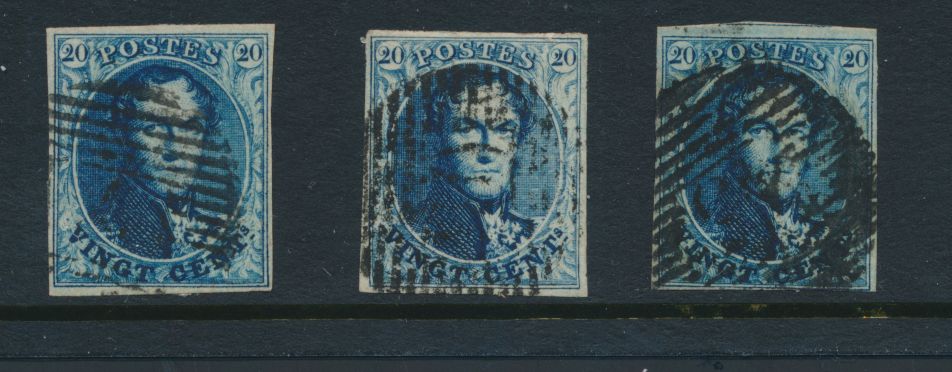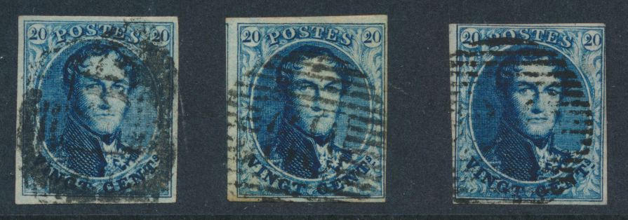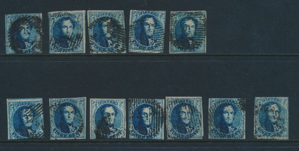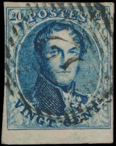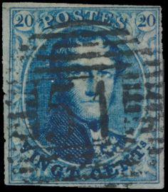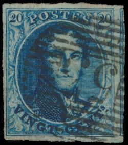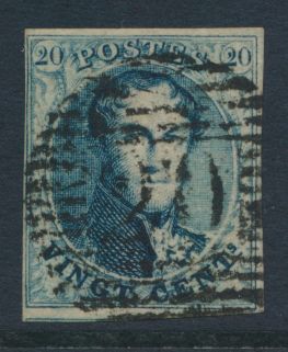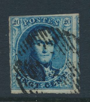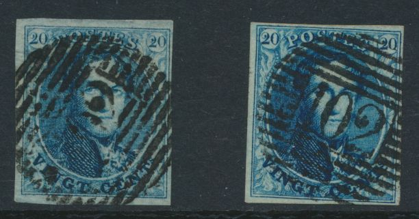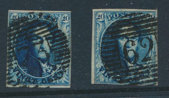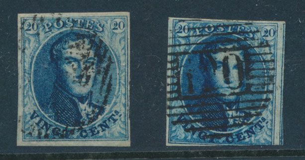 966 0 imageN° 4 "20c. blue", fully margined but both close. Canceled Liège (P.73) and Huy (P.62), vf (OBP €140)(Image 1) (All Images)
