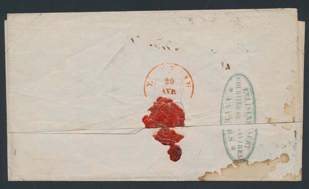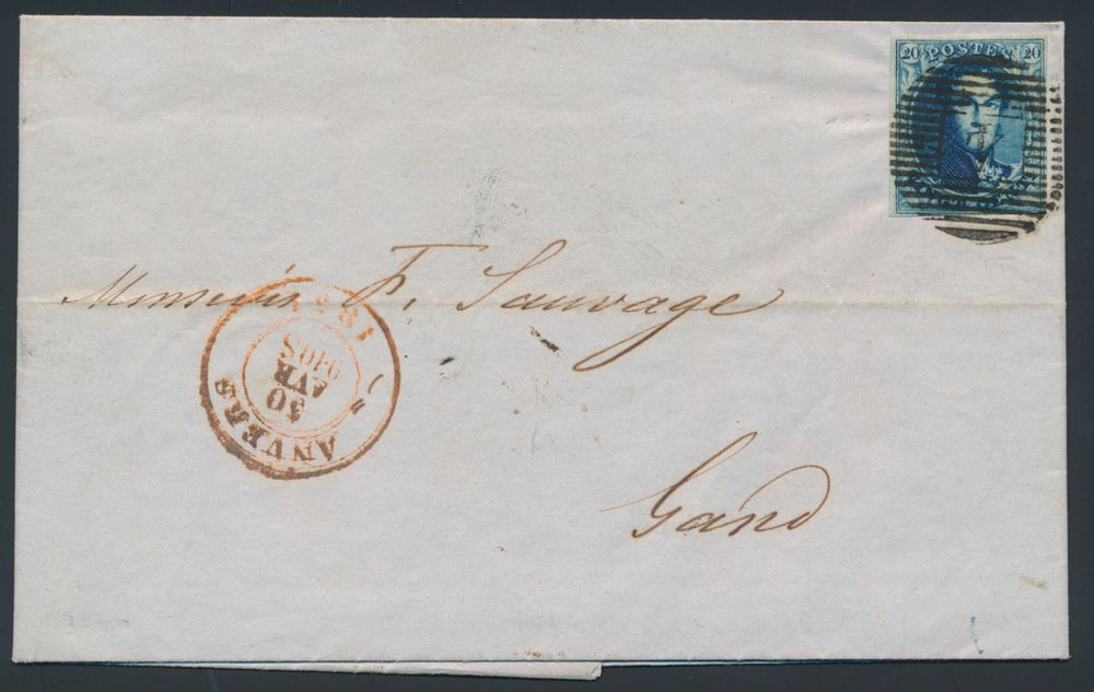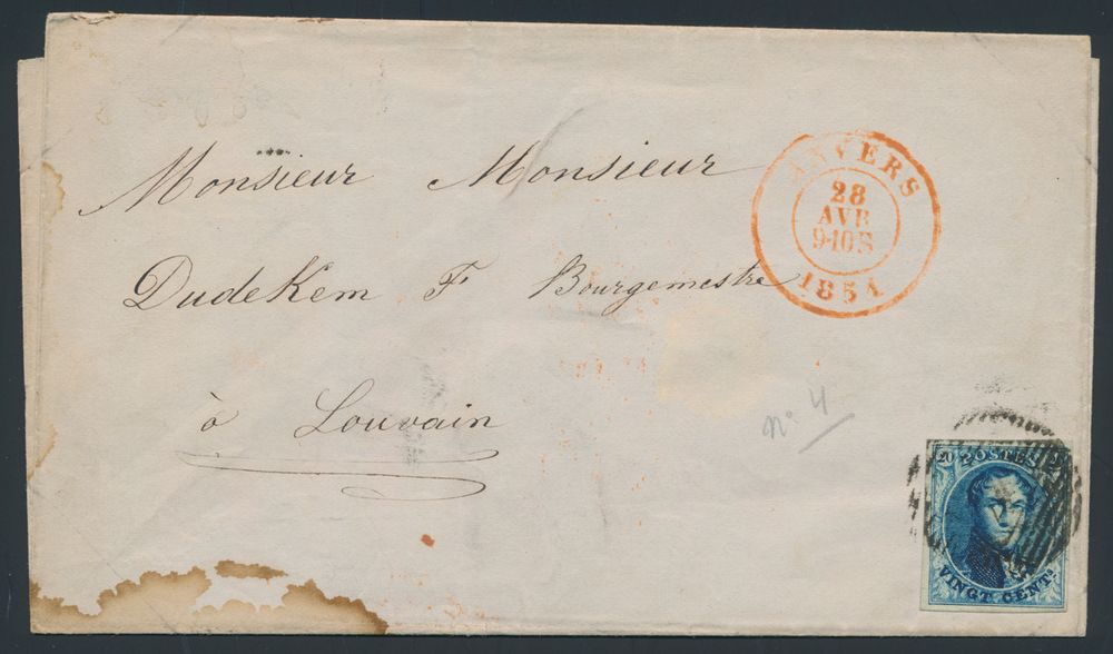 969 image1851 N° 4 "20c. blue", on letter without content, fully margined, from P.4-Anvers, dated 28 April 1851 to Louvain, vf/f (OBP €150)(Image 1) (Image 2)