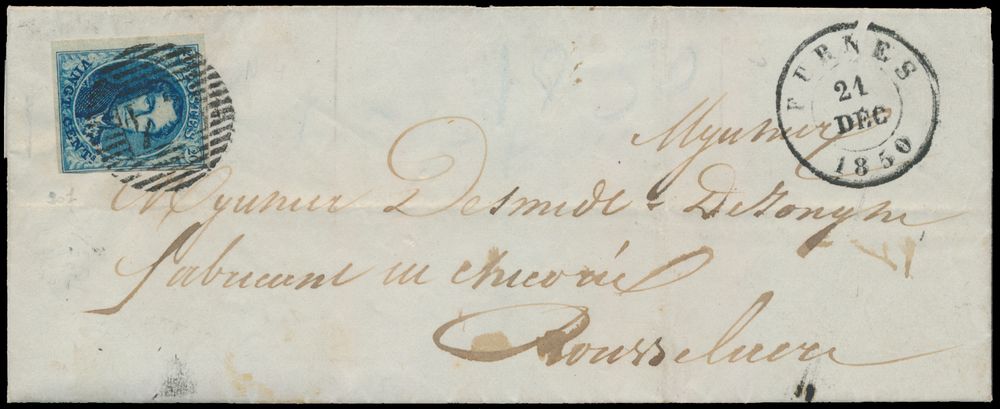 968 imageN° 4 fully margined with wide left margin, on letter with contents, cancelled P.44-Furnes (in black), 21 Dec 1850, to Roeselare, with receipt mark, vf (OBP +€150)(Image 1) (Image 2)