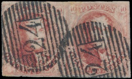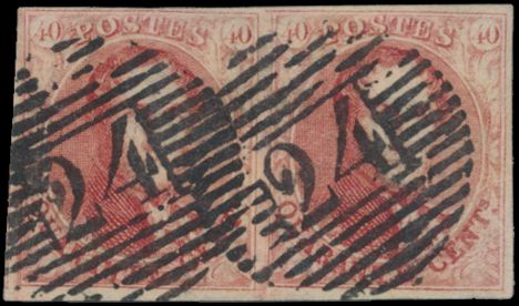 980 0 imageN° 5 "40c. crimson", in pair, fully margined, cancelled P.24-Bruxelles, two beautiful curiosities (extensions of frame lines), positions 145 and 146, vf (OBP €1,300)(Image 1) (All Images)