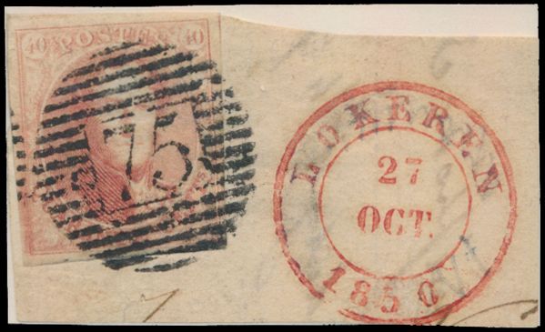 987 0 imageN° 5 "40c. crimson", on fragment, fully margined with neigbour, cancelled P.75-Lokeren, dated 27 October 1850, vf (OBP €575)(Image 1) (All Images)