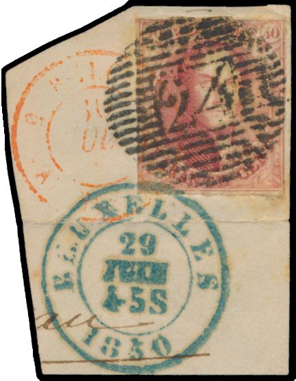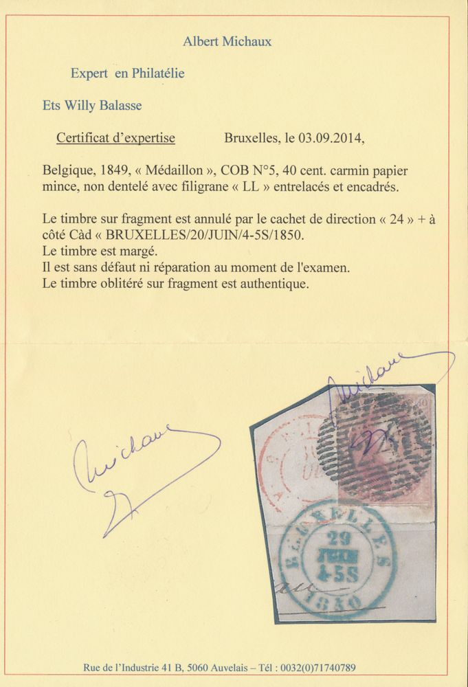 981 0 imageN° 5 "40c. crimson", fully margined on fragment, cancelled P.24-Bruxelles, dated 20 June 1850, with photo certificate, vf (OBP +€575)(Image 1) (Image 2)