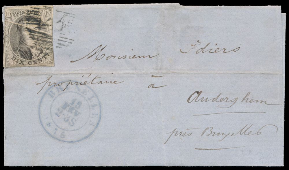 997 image1855 N° 6-Cu "10c. brown" on letter from P.24-Bruxelles, 15 Feb. 1855 to Auderghem (facteur 45), stamp is indented but with accordion fold, f(Image 1) (Image 2)