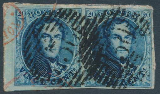 1082 0 imageN° 7 "20c. blue", fully margined pair, with left margin, trace of upper and lower neighbour, central cancel P.130-Wavre, vf(Image 1) (All Images)