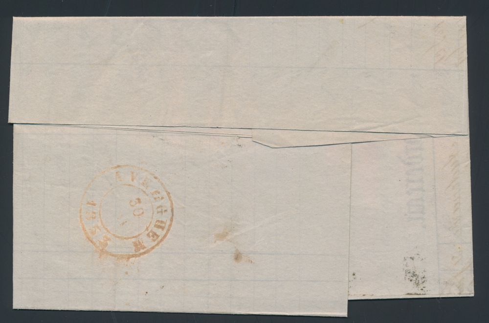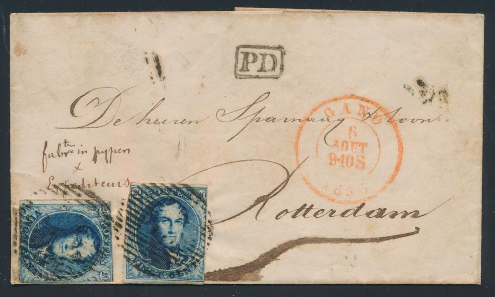 1094 image1855 N° 7 "20c. blue", letter without contents, cancelled P.45-Gand, two items both incised, dated 6 August 1855, to Rotterdam (Netherlands), "PD" in box black, manuscript " fabr. in pipes and forwarders", franking: "40c.", vf(Image 1) (Image 2)