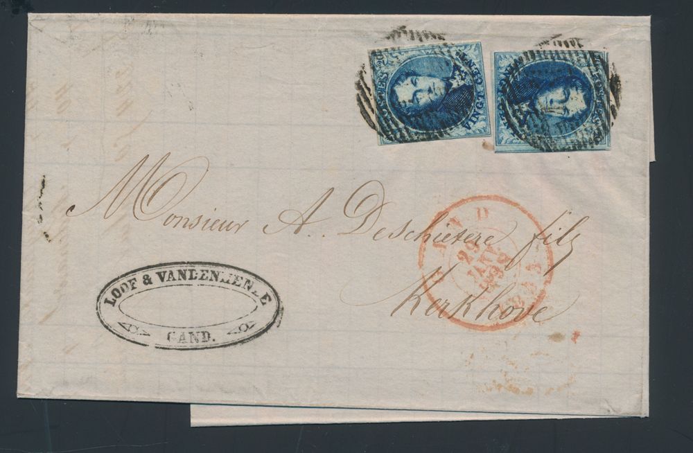 1091 image1853 N° 7 "20c. blue", two ex. (with neigbour) on letter with contents, from P.45-Gand, dated 29 January 1853, to Kerkhove, with arrival postmark Avelghem, double charge inland, more than 30 kilometres, no indication of weight, vf(Image 1) (Image 2)