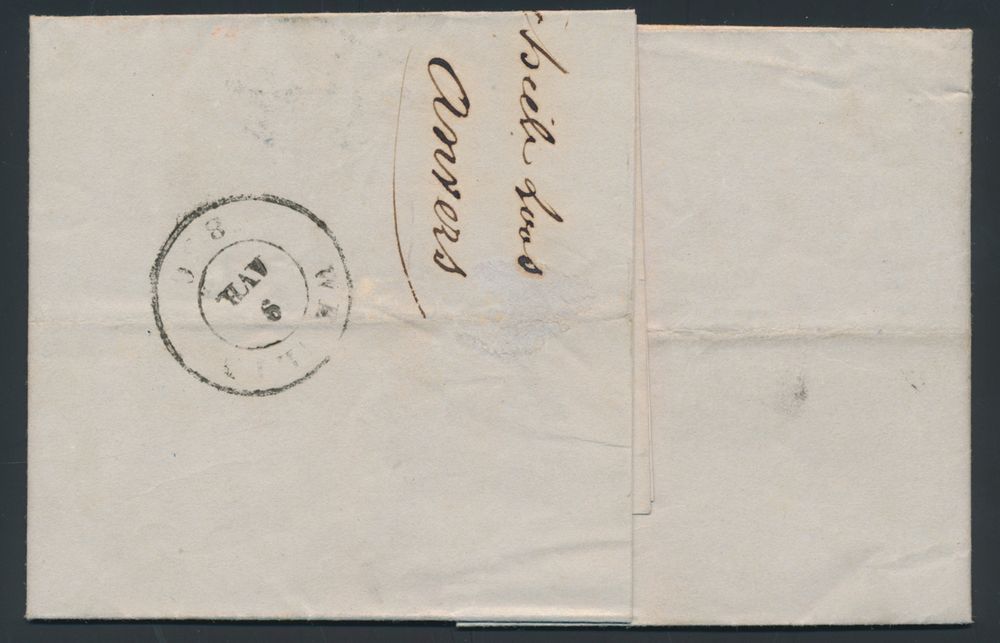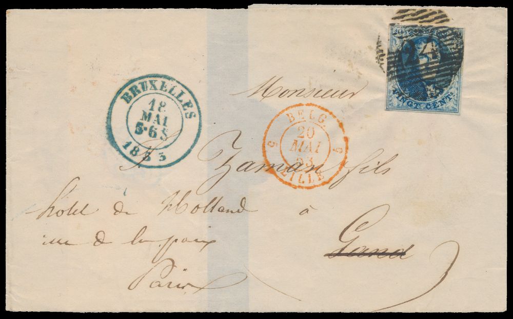 1090 image1853 N° 7 "20c. blue", on letter without content, fully margined, from P.24-Bruxelles, dated 18 May 1853, to Gand, correct franking with "20c., but the letter cannot be delivered in Gand and a new address is given on the letter, namely "Hotel De Hollande, Rue de la Paix, à Paris" (France), a "Debourse Gand" cancellation is also applied on the reverse, arrival postmark of Paris is on 20 May 1853, f(Image 1) (Image 2)