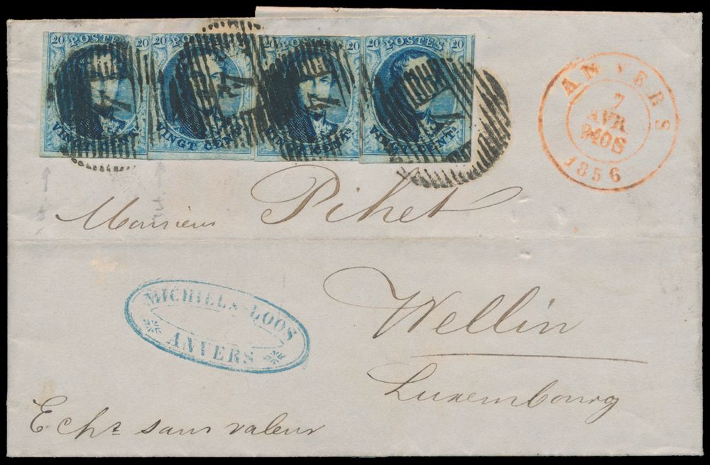 1095 image1856 N° 7 "20c. blue", 4 ex. on letter with contents, from P.4-Anvers, dated 7 April 1856, to Wellin, manuscript "Ech sans valeur" (sample without value), triple charge inland more than 30 kilometres, vf/f/to be checked(Image 1) (Image 2)